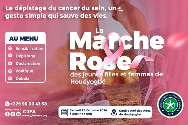 Le dépistage du cancer du sein est un geste simple qui peut sauver des vies, et pourtant, dans de nombreuses communautés, il reste trop souvent négligé. C’est dans cet esprit que le Groupe des Jeunes Filles et Femmes Autonomes (GJFA) organise la Marche Rose des jeunes filles et femmes de Houéyogbé, un événement essentiel qui aura lieu le samedi 26 octobre 2024.